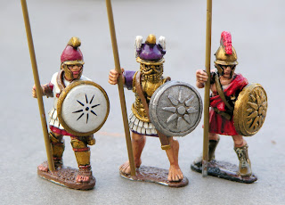 The middle figure is an Aventine elephant crewman, with a Foundry shield. I love the helmet on this figure and want to fit some into a mixed unit along with some Foundrys and Polemarchs. I presume Aventine will sculpt some, later, with greaves (which one obviously doesn't need in a howdah!). I did this one in expensive purple clothing and a silver shield, as an Agyraspid. It looks OK, but I think it would look better still with iron or silvered armour to go with the silver shield, and perhaps paler clothing colours.