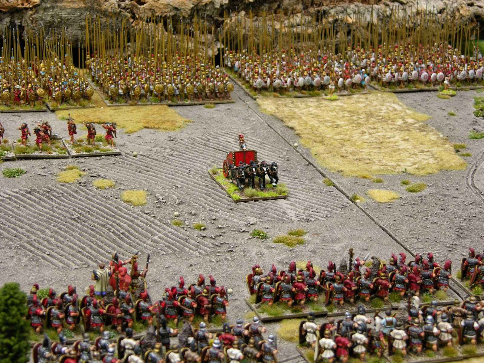 To eliminate measurement, I decided to use a square grid. From my Zama game back in 2010, I had learned to appreciate the speed that the hex grid in Command and Colors Ancients brings to a game. A square grid, however, is quick to mark out and has the benefits of making it abundantly clear where a unit's flanks and rear lie. The grid itself is very subtle; I just mark the corners of the squares with a tiny black dot. The use of a grid also enables figures which have been based for use with a variety of different rule systems, to be used together on the same battlefield.