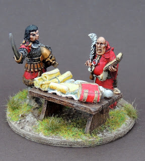 This is a recently refurbished command stand for my fantasy gaming using "To the Strongest!" set in the world of Glorantha. It depicts the Lunar general Fazzur Wideread remonstrating with his commanding officer, Euglyptus the Fat, at the battle of Building Wall. The battle was a disaster for the Lunars and Euglyptus was either poisoned or drowned in a barrel of lampreys (depending on who you read) shortly thereafter.
