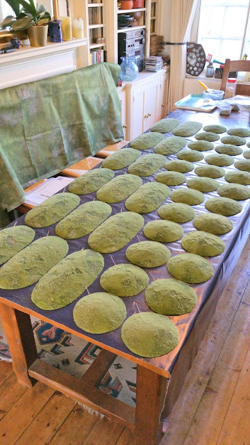 The hills are pretty much finished- once dry I'll remove the surplus flock and the gravel and dark green layers below will show through. You may be able to see that the colour is a good match for the Deep-Cut plains mats (in the background). I'm taking no fewer than nine mats and forty-five hills to the Worlds at Chalgrove on Saturday!