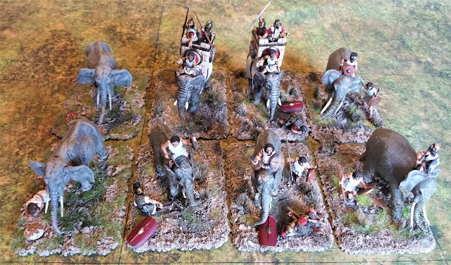 I have added two Agema elephants on the left (still awaiting mahouts). I had a hand in the design of these, and they are, consequently, the most accurate forest elephants of the various types shown. I still need to flock and tuft the bases to match the Savannah steppe mat on which they will be fighting. They are on Batbases of my own design. Better photos to follow when they are finished.