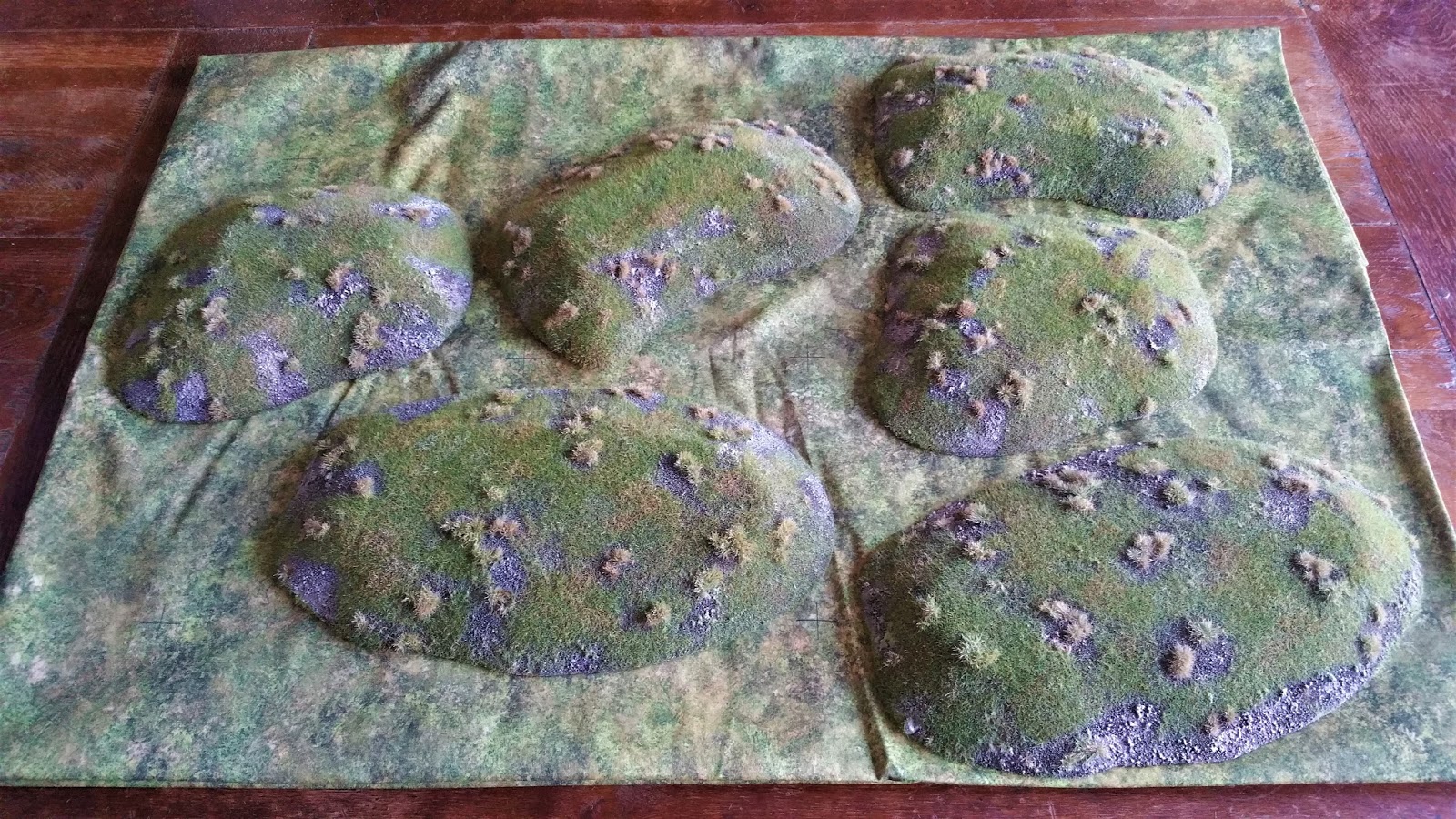 I'm now in the final stages of preparation for the Wargames Holiday Centre gaming weekend in Basingstoke. Here are some old GW hills that I've re-purposed to match the "sagebrush" gaming mat for my Ruspina game (the one with all the Numidians). These are great products- sadly OOP but often encountered on eBay- sturdy, light and stackable. I've added scree, repainted, flocked, tufted and dry-brushed.