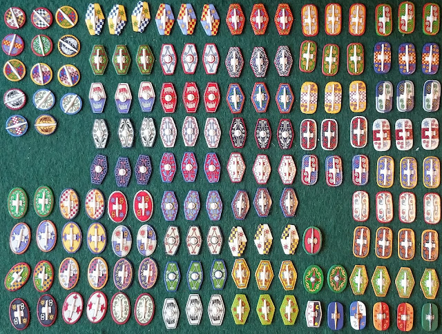 Next I need to paint some of the shield ribs (I'll leave most white) and after that the 130-odd shield bosses. Then there's inking, varnishing and the shield backs- perhaps another four sessions, in all. I suppose including cutting and preparation there will be around 15 evenings work to produce 150 shields - it'd take a lot longer if I was doing one pack at a time.