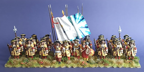 The minis are from the 1672 range, owned by Nick at North Star. The Swiss are some of the finest minis in this fine range. I painted the pike and most of the officers, the other minis were beautifully painted by Richard O'Connor. My friend Ian designed the flags; because of the way I folded them, half the detail (like the painting of the annunciation on the Colonel's flag) is, unfortunately, obscured. :-/ The wobbly-edged bases are my own trusty FK&P6's, with built-in magnets. Ian also flocked the base, which I tufted.