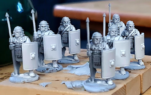 To finish my yellow and black shield cohorts, I find I need to paint a few more legionaries in red (the colour of Mars) tunics, because I don't want the two units to be mostly in white tunics as it seems a little unmilitary!. These are they, still only partially blocked in after two nights work. Starting to paint 7 minis from scratch has served to remind me why I like to get Shaun McTague (or Redzed) to paint most my minis! I think it'll take 5 or even 6 evenings to finish these 7 minis, and I need 234 more to finish the two legions. :-/