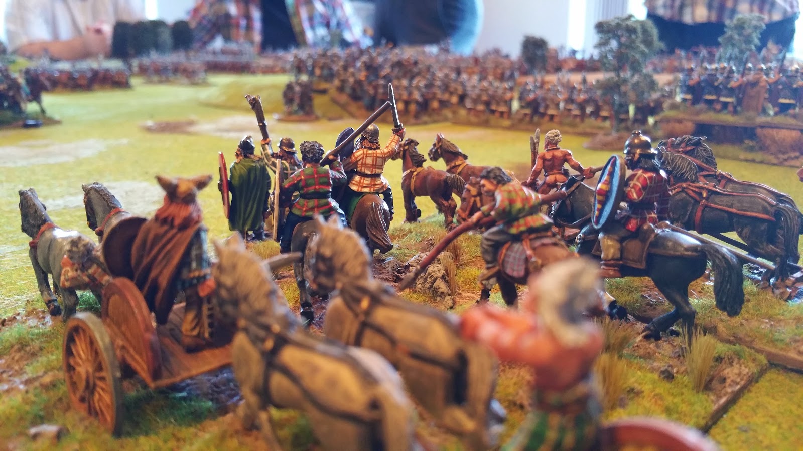 When the two armies met (near a burning Cirencester) we transferred the action to the tabletop, and fought it out using my miniatures and To the Strongest! rules. The Britons formed up in a huge mass with chariots to the wings and the laager to their rear.