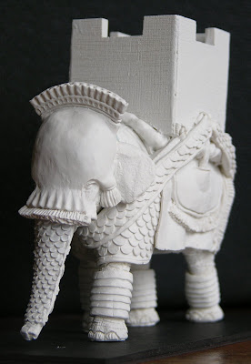 The elephant is very easy to assemble, just requiring the head and metal trunk and tusks to be attached. I have left the tusks off for the time being, because it will be easier to paint with them absent. I had to do a small amount of filling on the join of the head and body, as you'd expect. There were a number of tiny airholes in the casting; less than I would have expected, though, and I easily filled these with greenstuff. One very minor issue with the model is that there are small crevices along the edges of the howdah; I filled these, too. After assembly I primed white.
