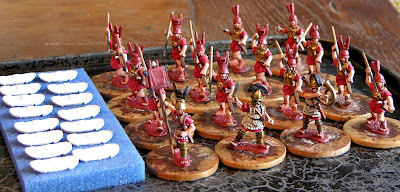 Here are the rapid Romans after 3 more painting sessions (bringing the total to 6). I think they are going to be quicker to complete than I'd anticipated- 4 more sessions should finish them, and with 2 for basing, that puts them around 2 weeks a unit.