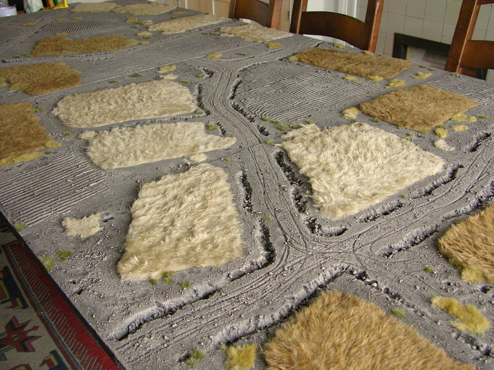 The flock disguises the dark brown edges where the base board paint had soaked into the fur, and makes the field edges appear less regular. I 've also been applying it on top of the fur which makes it seem more natural. What I haven't done, yet, is to apply flock around the drainage ditches. I intend this vegetation to be greener, to inject just a little colour onto the brown-grey boards.