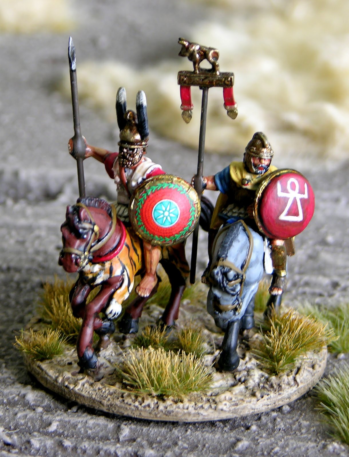 This represents the nameless commander of the Carthaginian right wing cavalry at Zama. The general is a converted Aventine Pyrrhic mahout, and his standard bearer Crusader, with an Aventine standard. Both horses are Foundry WotGs. Very ably painted by Nick Speller, and based by yrs. truly.