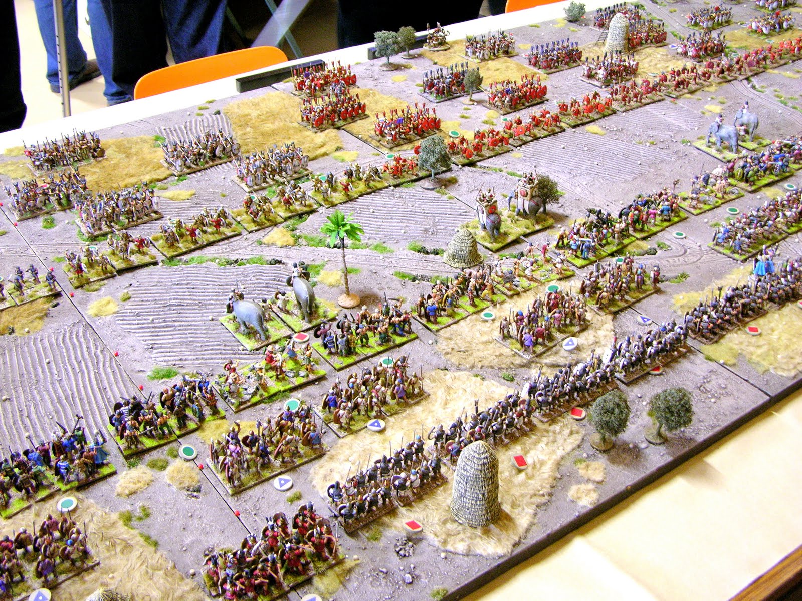 And, finally for the moment (below) an aerial view of the battlefield; Carthaginians in the foreground. The three lines of the Carthaginian deployment can be distinctly made out, with their elephants in front. You should also be able to see the four Roman legions with their "elephant channels", and Numidian foot deployed to their right. The two central legions have red shields, and the outer allied legions, white.