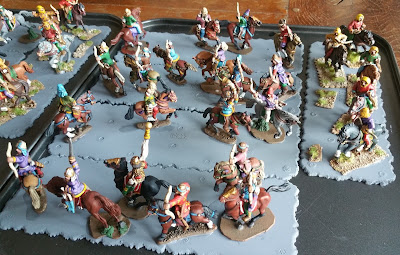 Here are some arquebusiers- again, Shaun's going to paint some more in black, and I'll remove around half of the above from the bases and replace. The bases are shallower Batbases from a new set I've had made. Below are four Florentine mounted crossbows, I'll need to get some more done because I want to be able to deploy them in big units of 12. If one is painting plastics, there's no excuse for stinting on the unit sizes!
