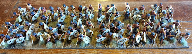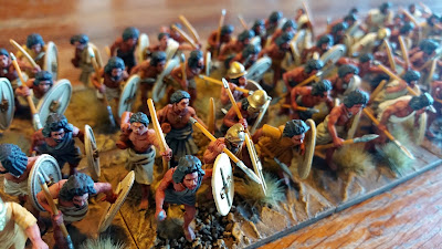 The "Leukaspides" (white shields) from a previous post are now on their bases. The Leukaspides were the less well trained element of the phalanx and presumably included the youngest and oldest men of the levy. To indicate this I have given some of them pikes of various lengths, held awkwardly. Very few of them have armour and only around half have helmets. I'll do a close-up when they are finished, in the New Year.