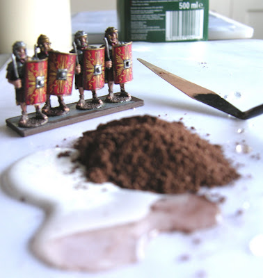 So above, we have the basing mix; roughly 1/3 wood glue, 1/3 water and 1/3 dry mix as per the last post. Stir it up with the palette knife, then apply to the base, as below. Can anyone guess why there is an arrow, cut into the square base with the archers on?