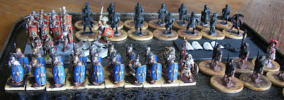 I'm progressing all-too-slowly with the blue-shielded cohort- it now includes 19 of the 20 minis I bought on eBay, and 5 more I have just painted to match. It'll have an aquila command stand by the time I finish. For all their dubious authenticity, the blue shields do look nice...