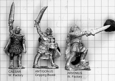 I was particularly disappointed by Caesar, which I'd hoped would be a splendid mini; unfortunately he just doesn't look like the portraits of the general that I've seen. There is something I don't quite like about the legs, either, and he is the ghastliest sword I've ever seen on a historical miniature. That'll have to come off if I paint him. Overall I don't think it's as nice as Copplestone's Tribunes in the Foundry range; he's just not imposing.