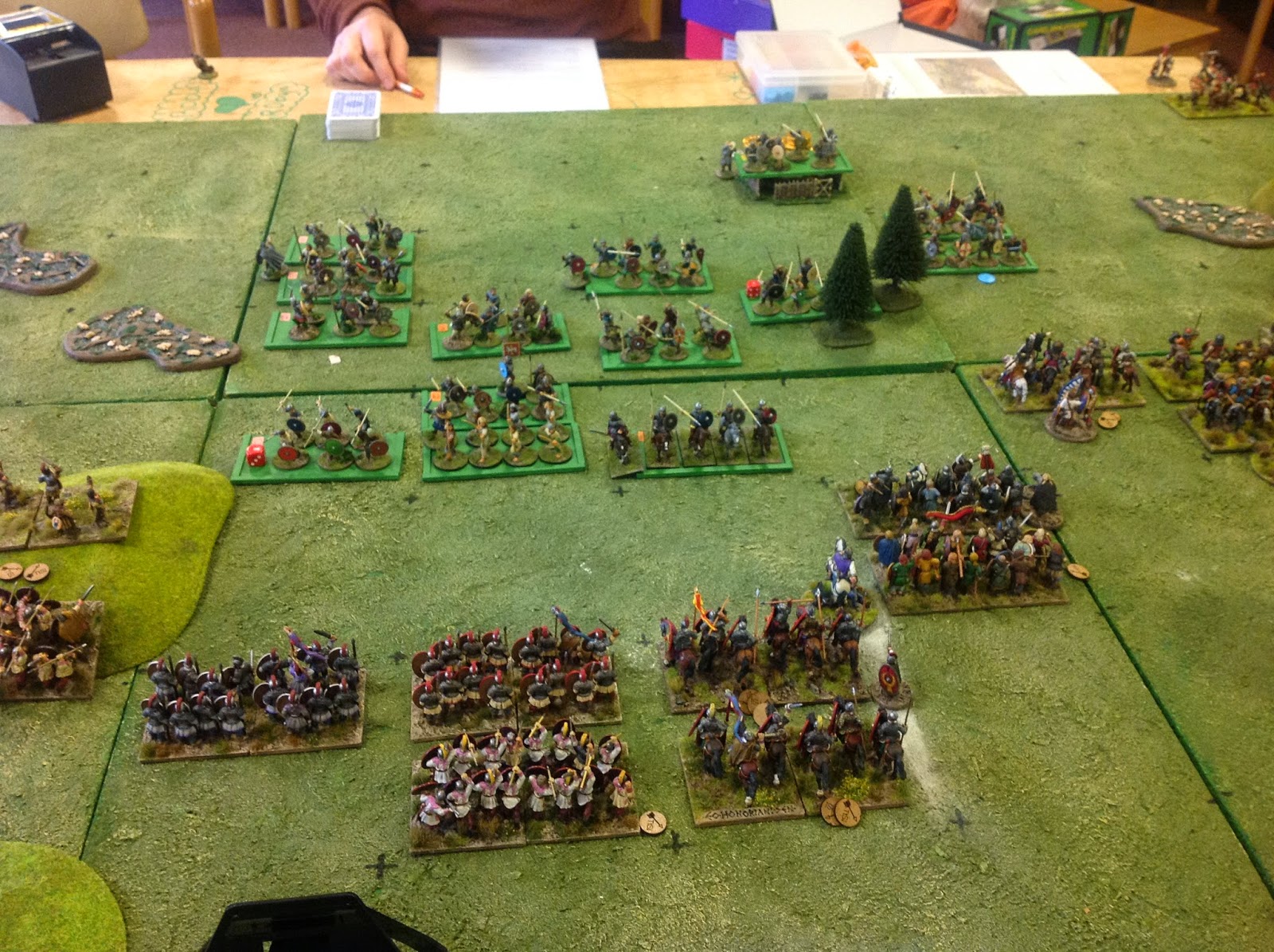 Unfortunately in the rush I failed to take many photos of the players, but I did get shots of some of the armies and games. Below, my "Decline" Romans in the foreground await (with considerable trepidation) the charge of John Sharman's Saxons. My Hun wing, led by Attila, had a good game, ending up behind the Saxon centre.