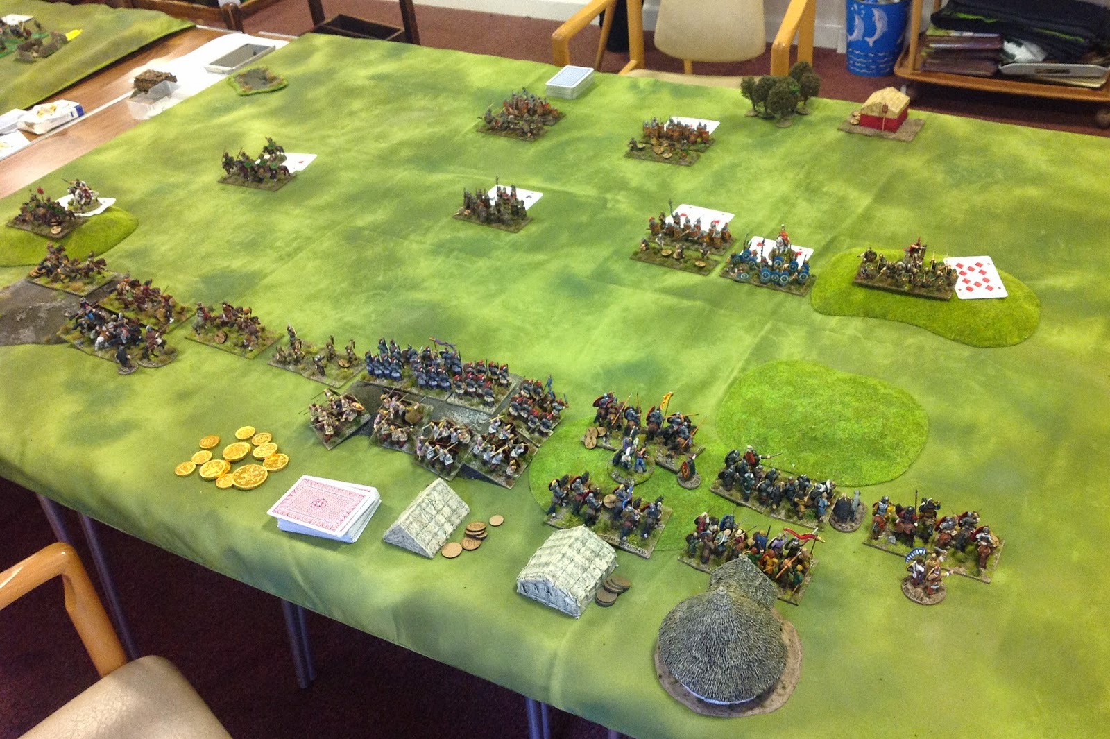Below my Decline Romans prepare to receive (my own) Early Imperial Romans, played by Trevor Holcroft. The Romans in my force didn't manage to kill anything at all, but their Hun and Gothic allies were lethally effective, especially the former who could do no wrong! Atilla was again definitely Man of the Match. Note the edible chocolate victory medals...